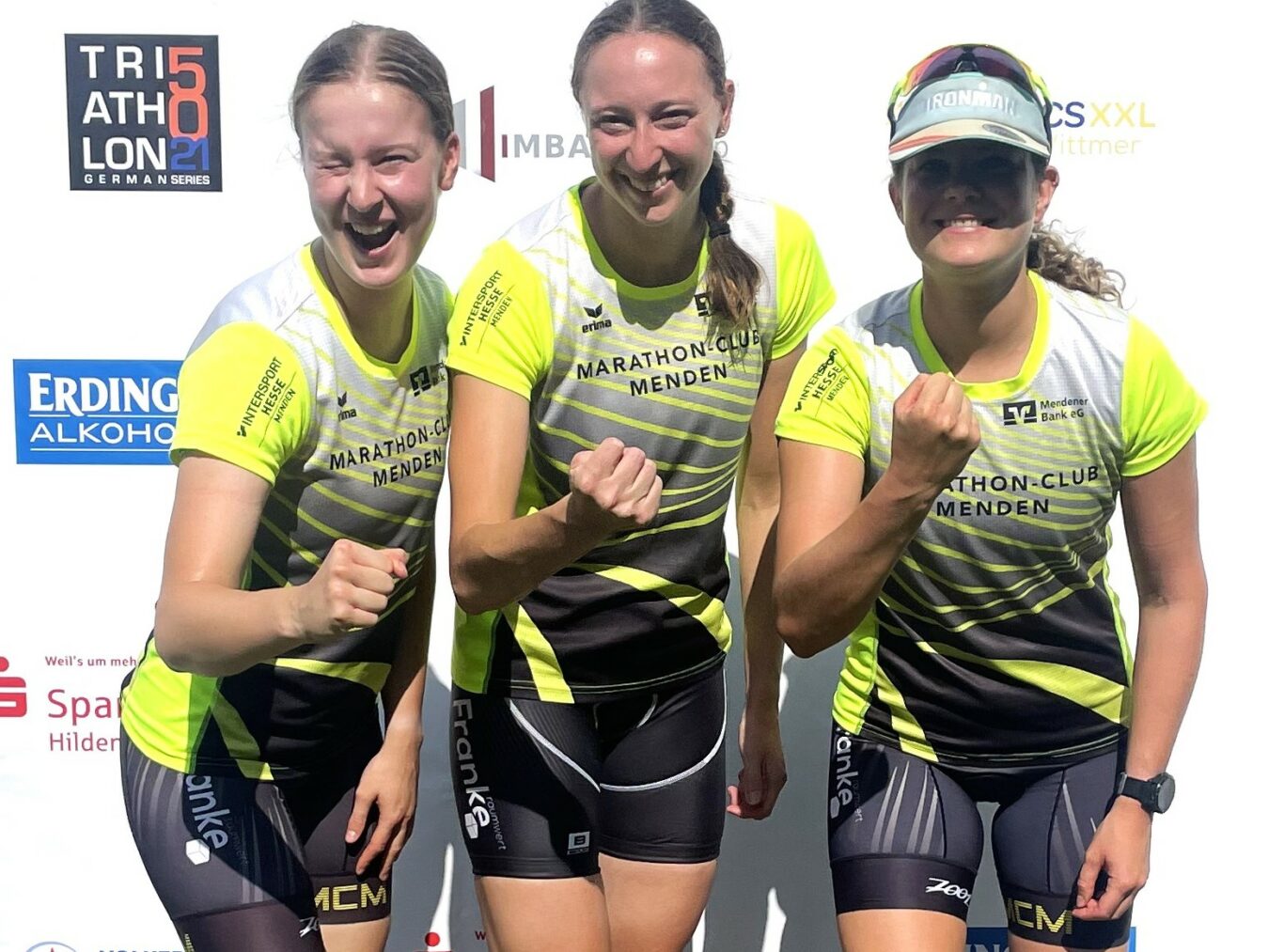 In Ratingen über 400m Schwimmen, 20km Radfahren und 5km Laufen kann Katrin Harnischmacher nach dem gewohnt überragenden Schwimmen ihre Herausforderin Katharina Abbing vom SV Blau-Weiß Bochum dieses Mal vor allem auf dem Rad von vorn auf Distanz halten. „Ich konnte sie dann aber beim abschließenden Laufen schon spüren, habe sie dann am Ende nicht mehr herangelassen.“ freut sich Harnischmacher über Platz 1 in 1:01:43 Std in der Gesamtwertung. Aber gerade die überzeugenden Ergebnisse von Marie Christin Severin auf Platz 18 in 1:1:04 Std und Pauline Simon auf Platz 33 in 1:17:46 Std machen den Team-Erfolg erstmals möglich. Als Mannschaft in Ratingen auf Platz 5 sichert man den abschließenden Tabellenplatz 4 und damit das Ticket zur Regionalliga.